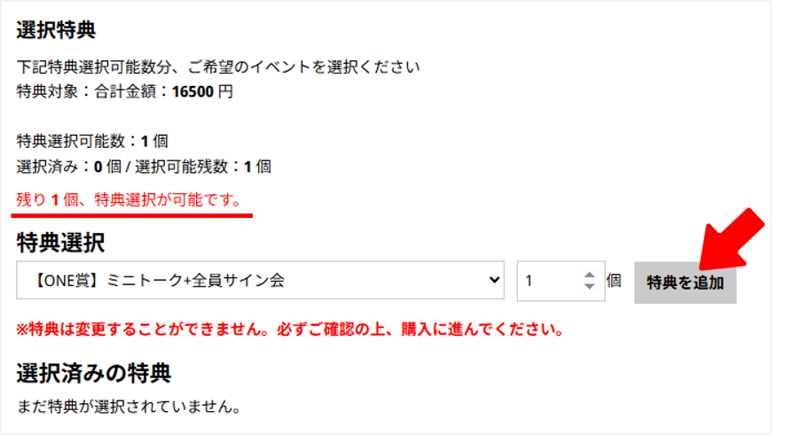 ・「①必ずメンバーとオフライン or オンラインで会える特典」に関して【GATHER Limited Edition】を1.5万円以上カートに入れるとカート下部に特典選択フォームが出ます。ご自身の特典選択可能数分イベントを追加し、決済に進んでください。