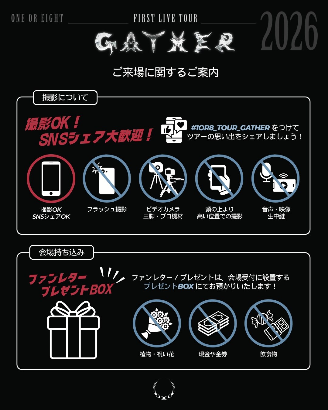 2026年3月7日(土)から開催されるONE OR EIGHT 1st LIVE TOUR -GATHER-の当日の撮影及び会場持ち込みに関するご案内になります。「ONE OR EIGHT 1st LIVE TOUR -GATHER-」の開催にあたり、会場にいらっしゃるすべての方々が楽しくライブをご覧いただくために、お越しの皆様へ大切なお願いがございます。